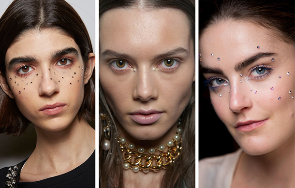 The face appliqués come as one of the biggest makeup trends for the following seasons. Although some might consider them not as real makeup, they are still part of the beautifying process done on the face. Taking the inspiration from the fashion world, the face appliqués are a symbol of the following season’s glam, glamour, and shine. They can come in the form of pearls, little shiny freckles, and even tiny jewels. These appliqués were seen on the runways placed strategically around the eye area, in a concentrated amount.